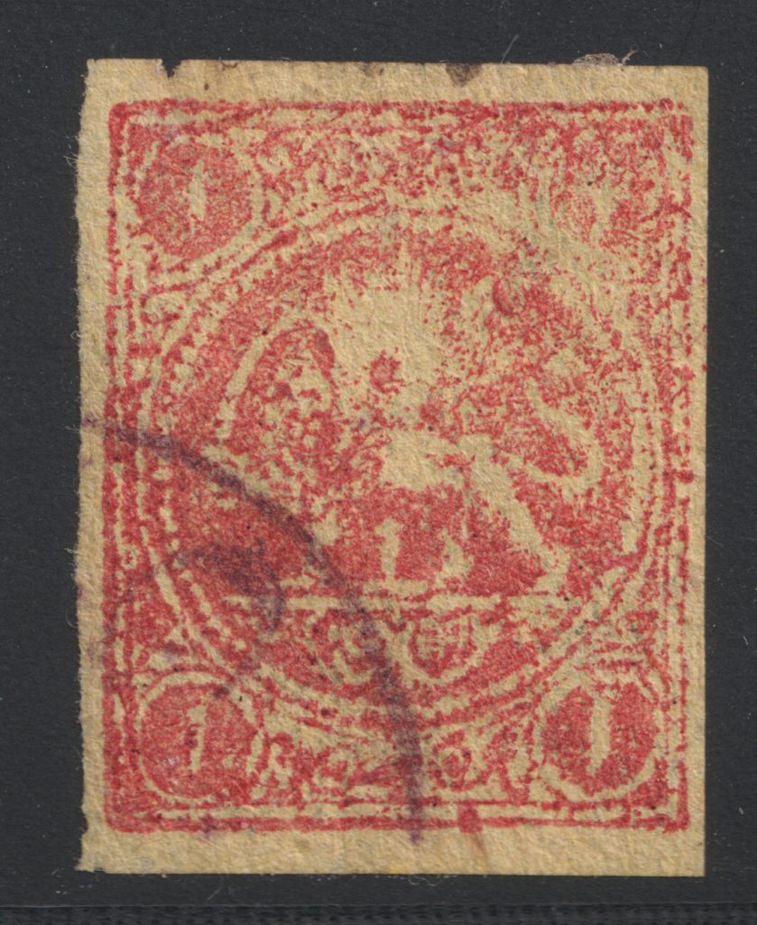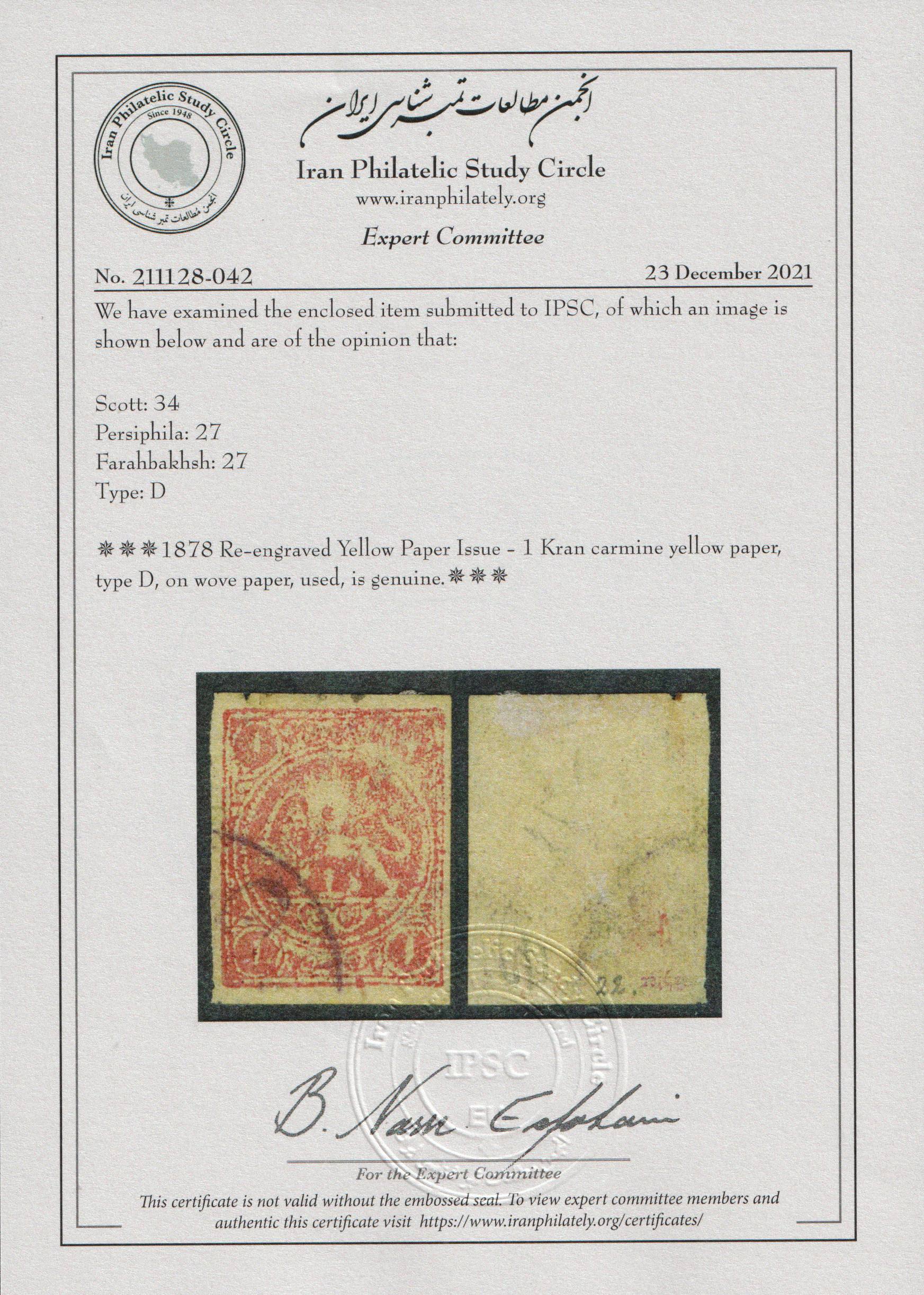 ” تمبر شیر و خورشید یک قران کاغذ زرد با سرتیفیکیت IPSC ”