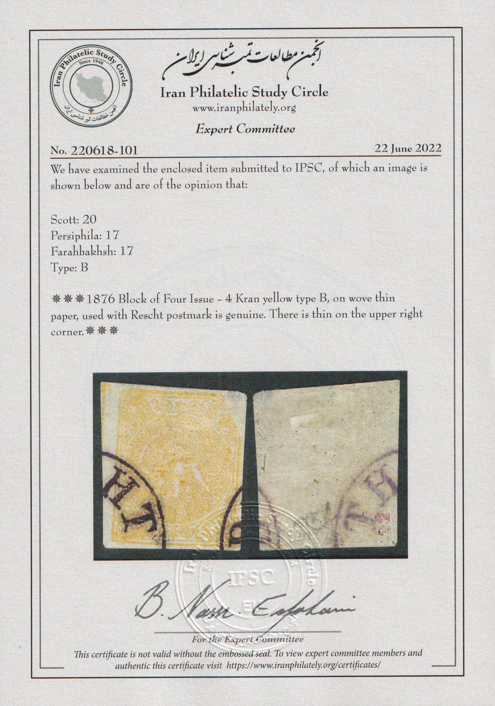 ” تمبر شیر و خورشید چهار قران زرد با سرتیفیکیت IPSC ”
