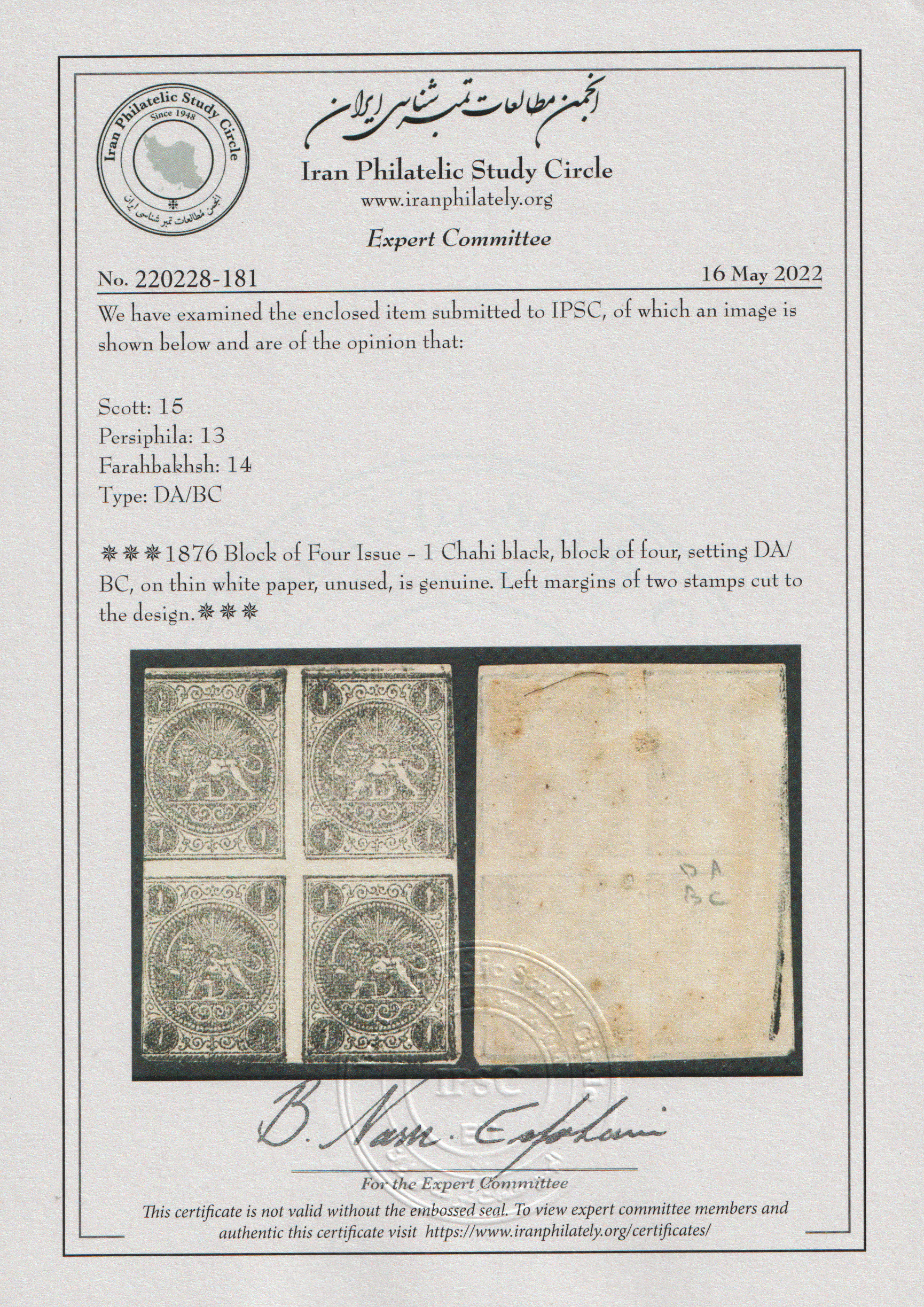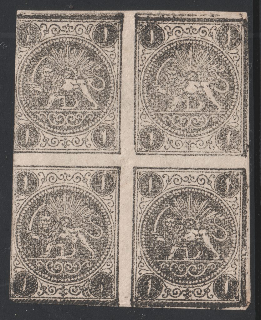 “تمبر شیر و خورشید یک شاهی سیاه خاکستری بلوک چهارتایی با سرتیفیکیت IPSC ”