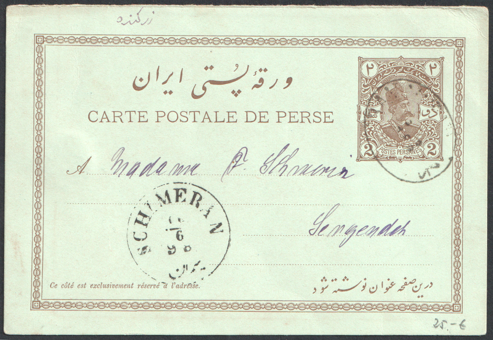 ” کارت پستال دو شاهی مظفری از تهران به شمران ”