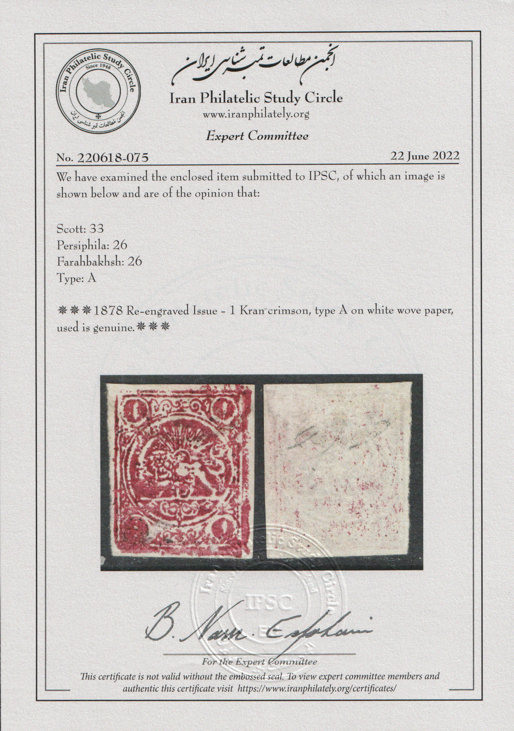 یک قران زرشکی از بلوک چهارتایی با سرتیفیکیت IPSC