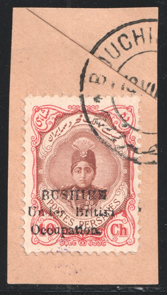 ارزش این تمبر روی تکه با مهر کامل بوشهر بسیار بالاتر است
