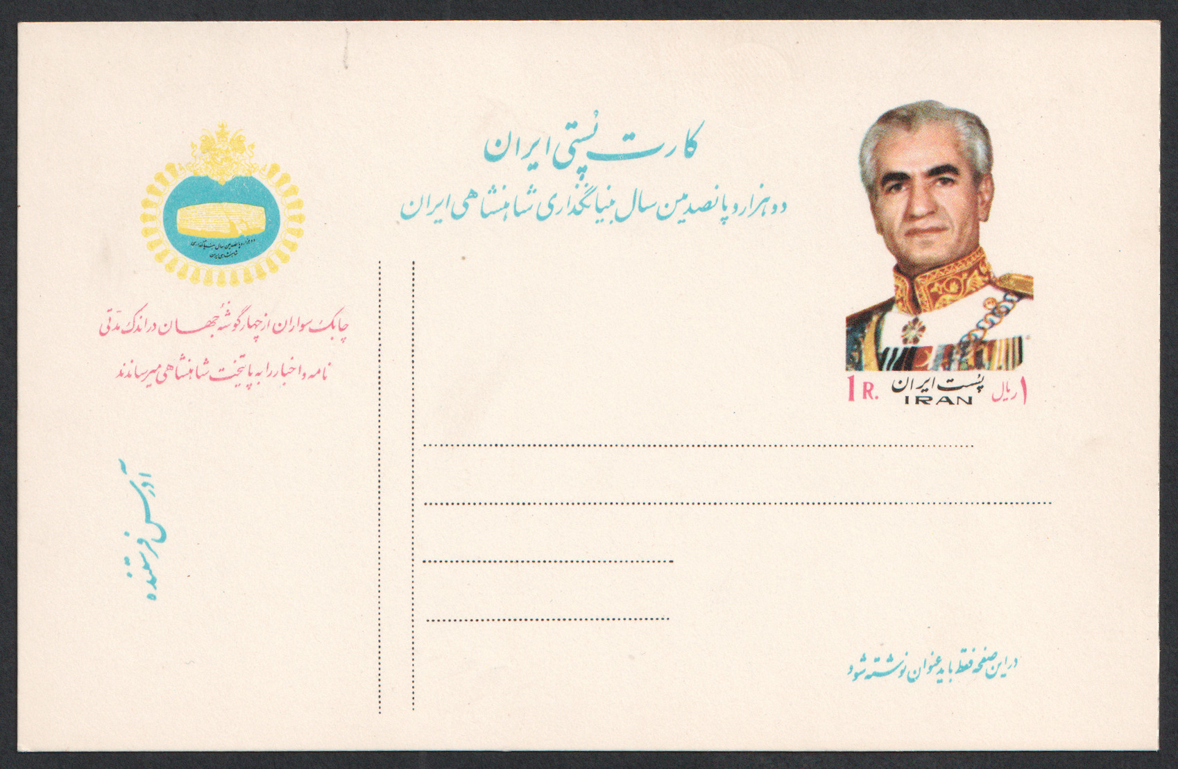 ” کارت پستال یک ریال مخصوص ۲۵۰۰دمین سال بنیانگذاری شاهنشاهی ”