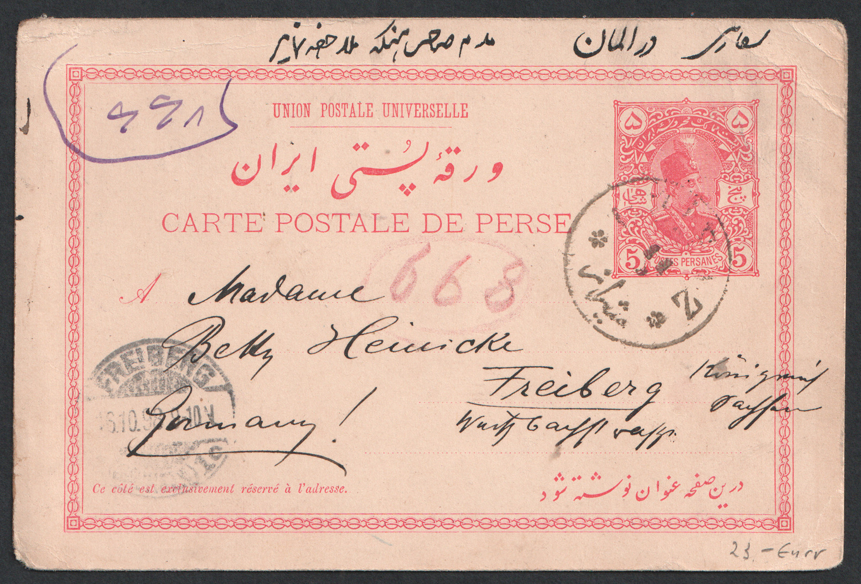 ” کارت پستال پنج شاهی از شیراز به آلمان ”