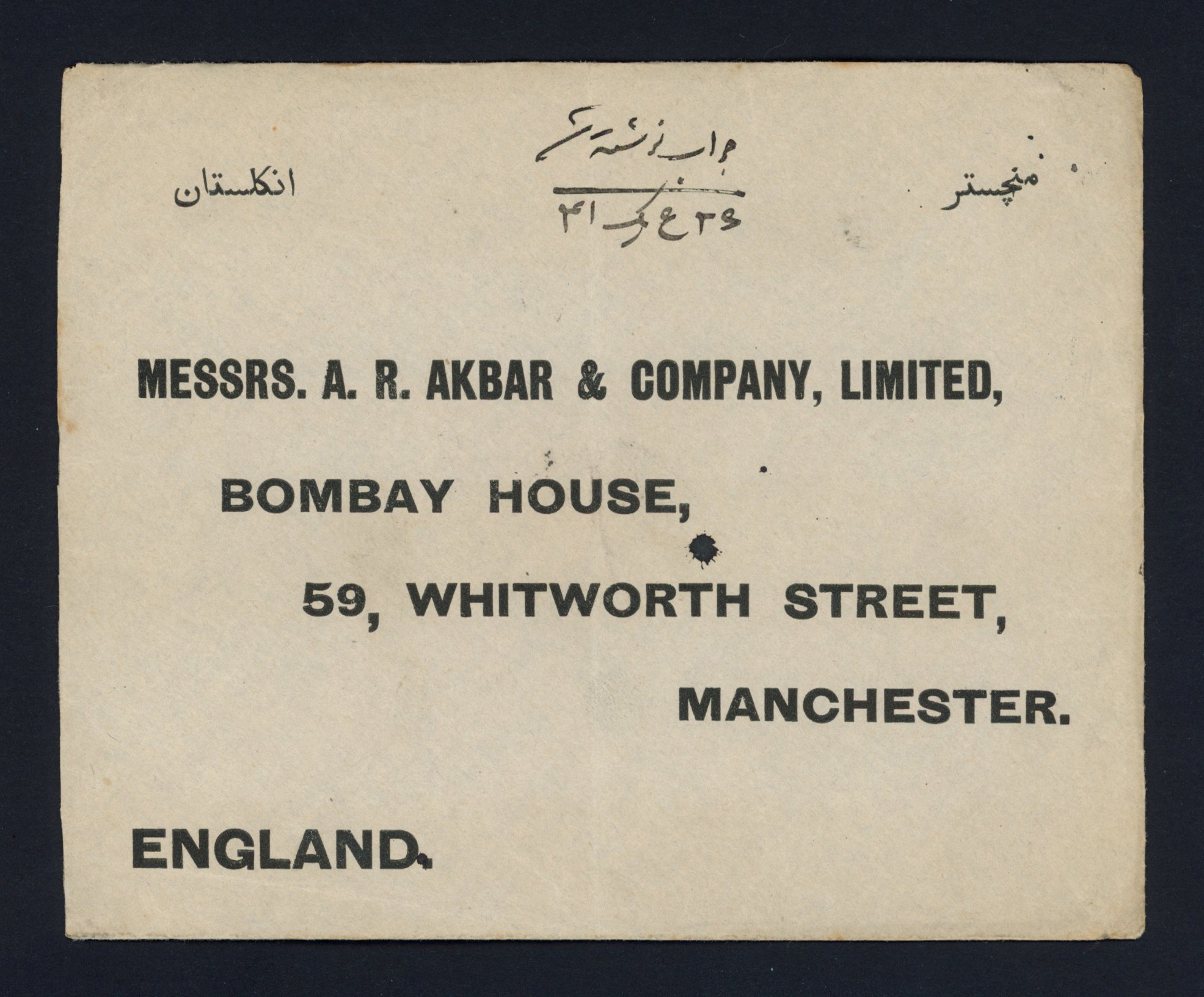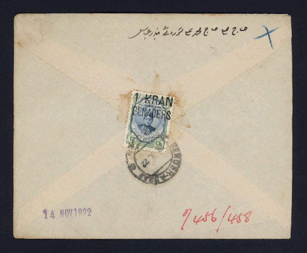 پاکت با تمبر سورشارژ 1 قران بنادر ارسال به منچستر