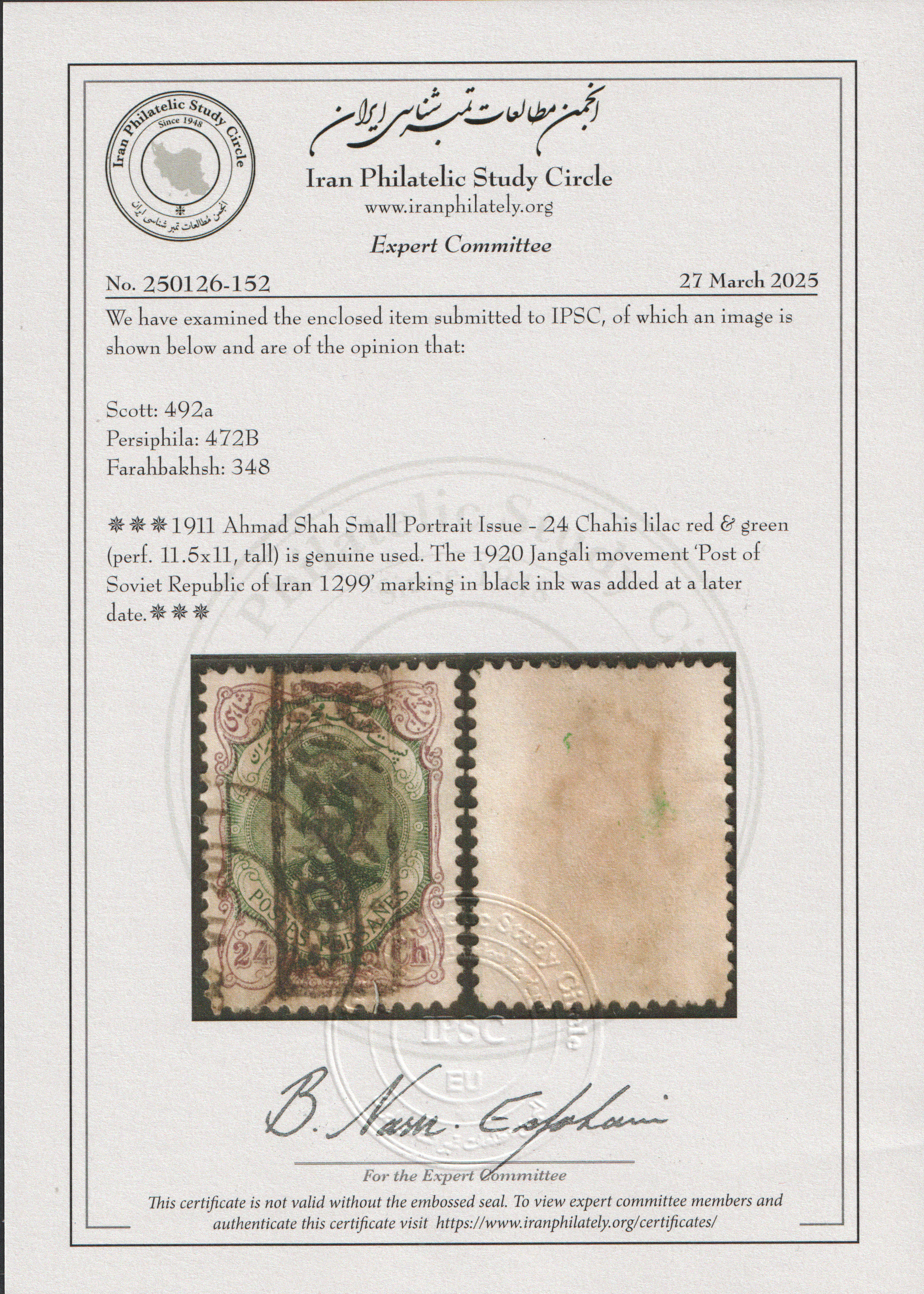 ” مهر نهضت جنگلی روی تمبر شش ۲۴ شاهی احمدی با سرتیفیکیت IPSC ”