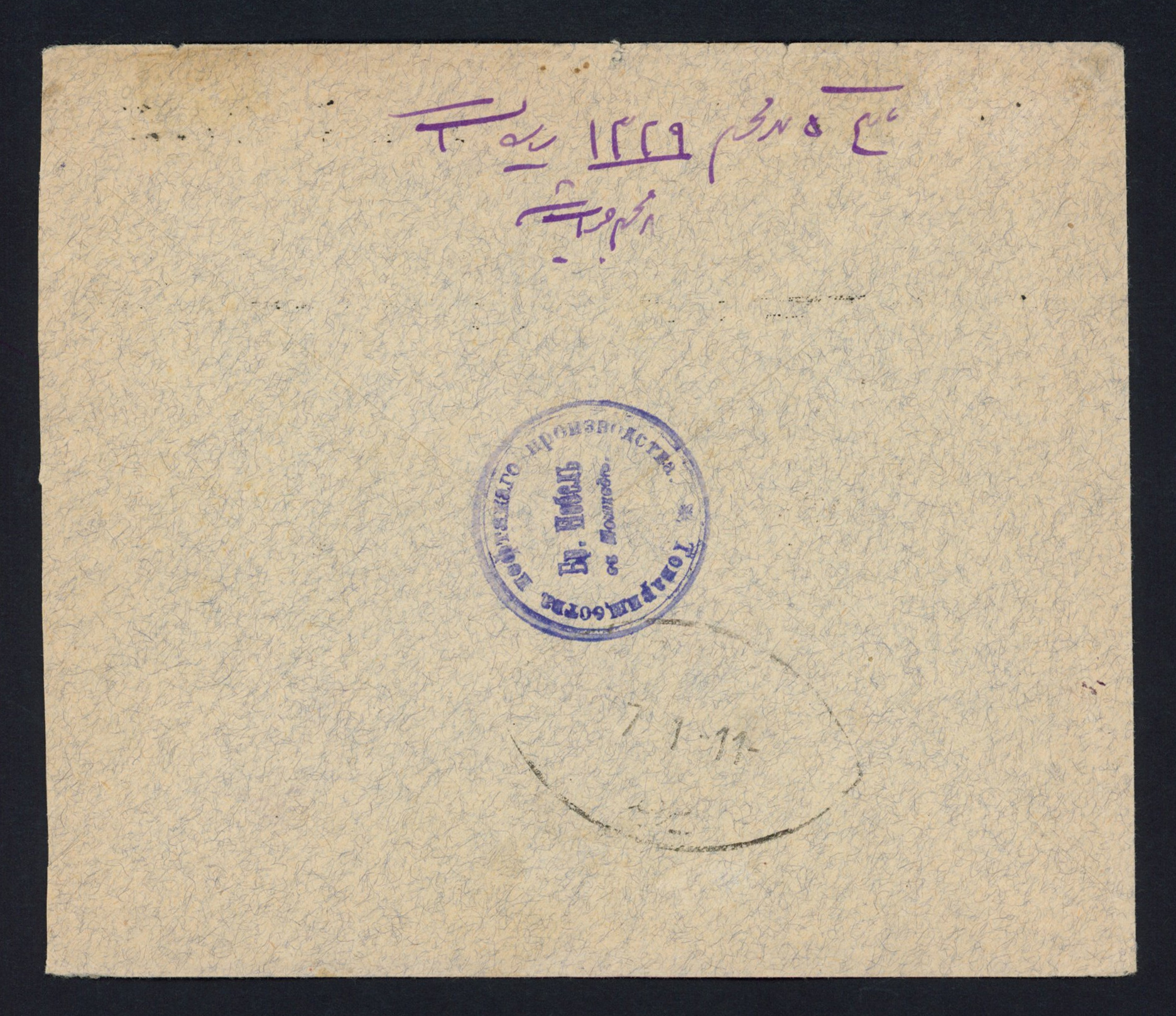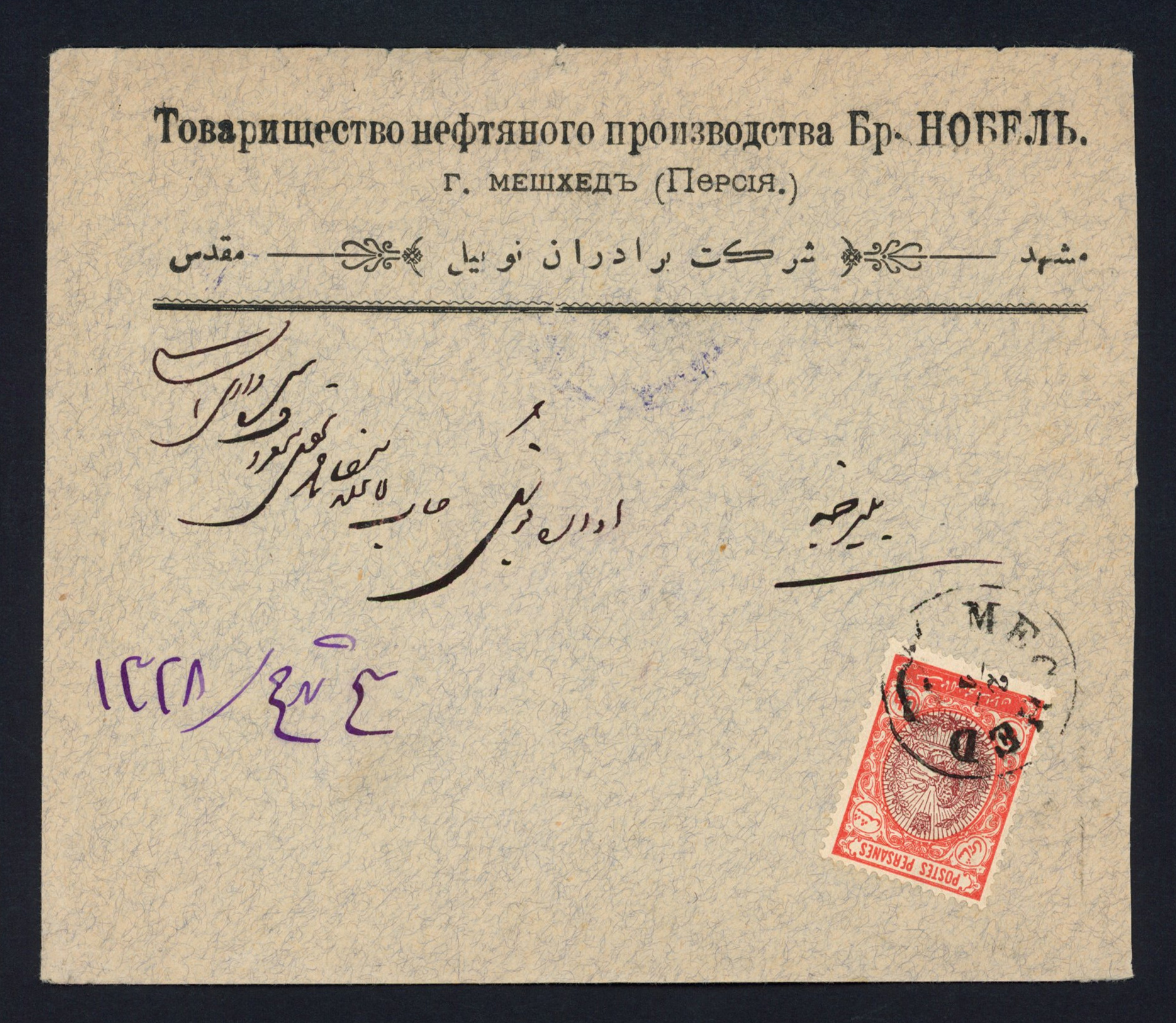 پاکت با تمبر مشروطه و مهر شیلدی بیرجند و سربرگ برادران نوییل