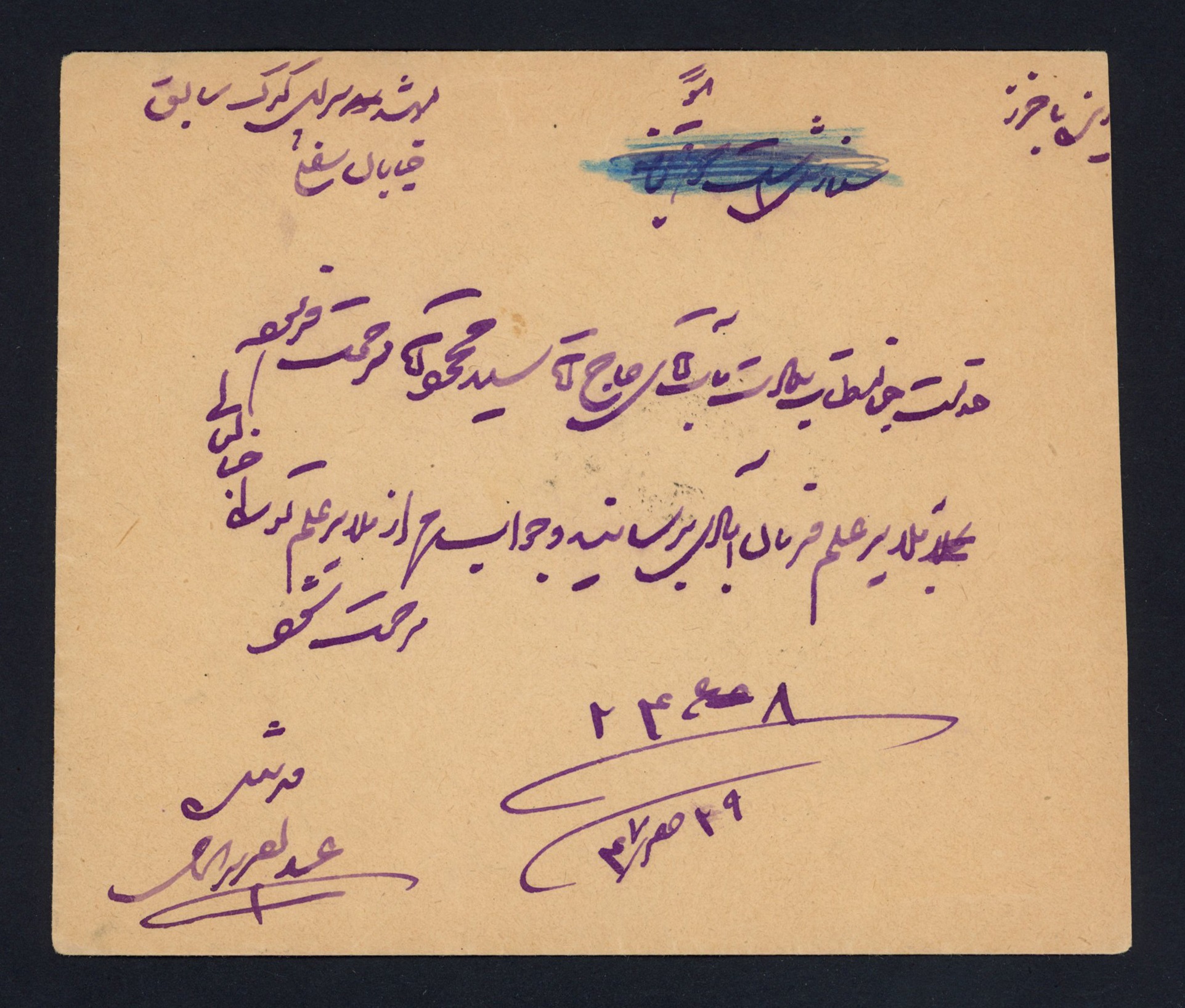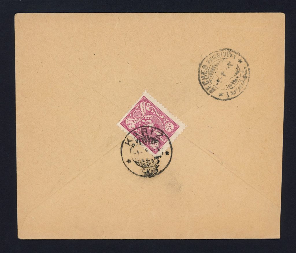 روی پاکت سفارشی دو قبضه نوشته شده و به دلیل وجود تمبر 6 شاهی خط خورده است.