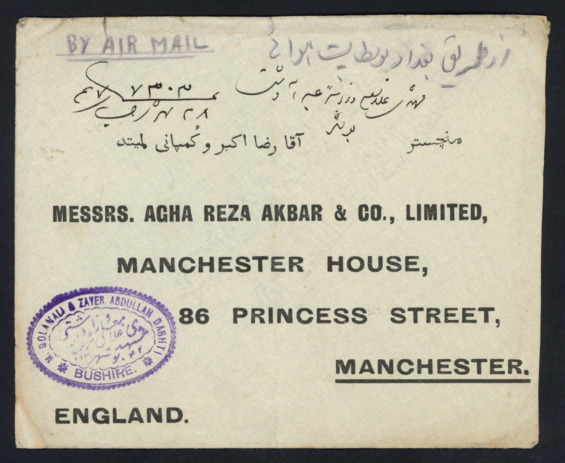 پاکت پست هوایی با تمبر 1قران سلطنت پهلوی ارسال به منچستر از طریق بغداد