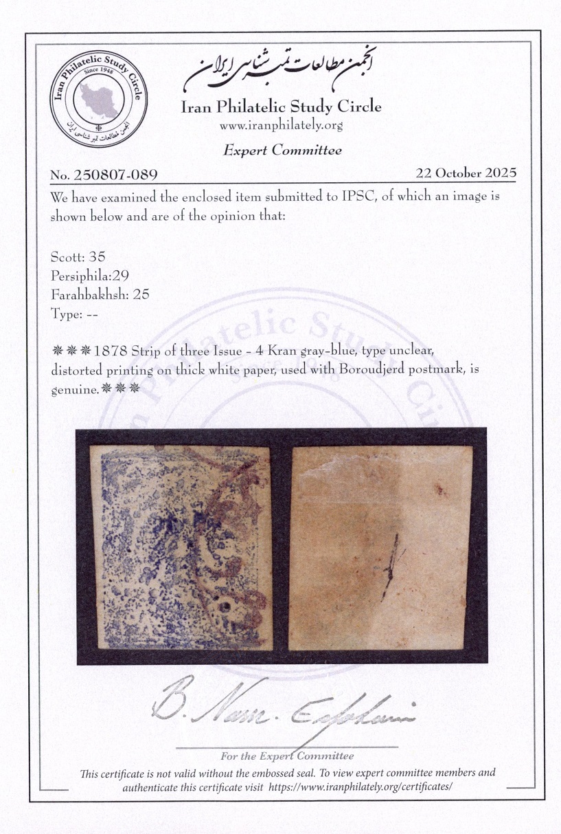 وارتیه کمیاب با مارجین خوب 4 طرف و مهر بروجرد که روی این تمبرها بسیار کمیاب است.
