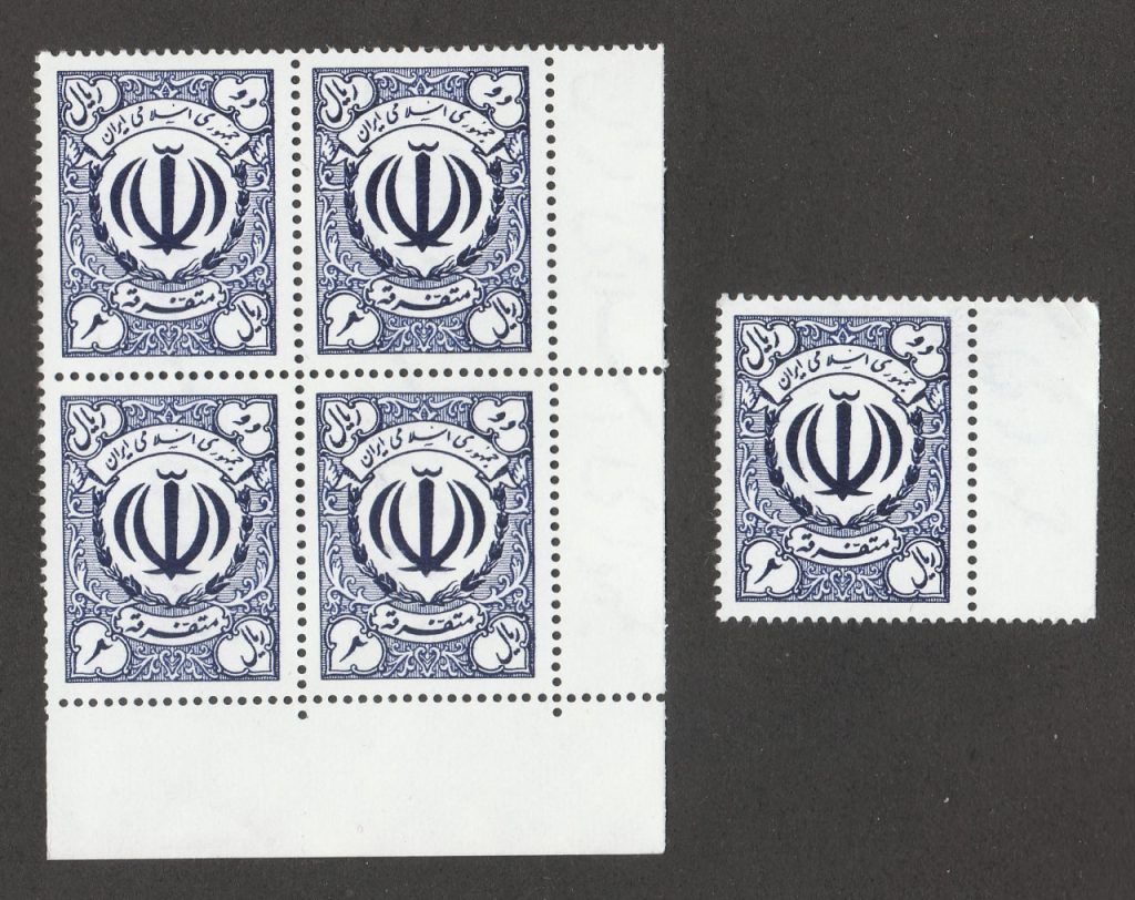 📌تک و بلوک گوشه ورق “کاغذ نازک تیپ ۲” رقم ۲ ریال بنفش آبی سری تمبر مالیه سری متفرقه (نسبتا نایاب)