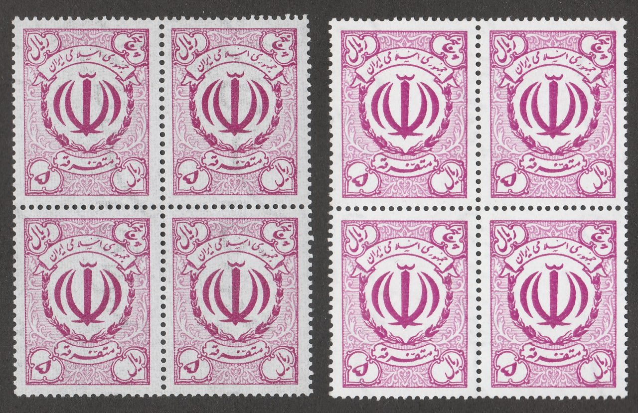 📌دو تیپ بلوک “کاغذ نازک” رقم ۵ ریال قرمز بنفش سری تمبر مالیه سری متفرقه (نسبتا نایاب)