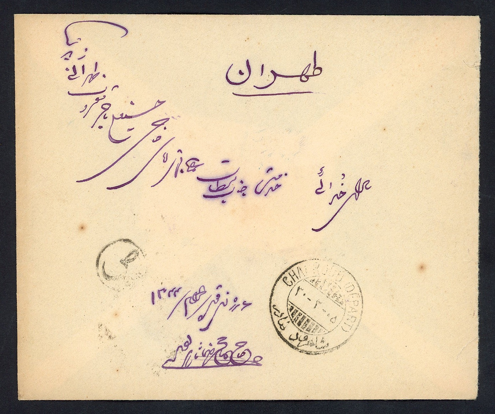 طبق قانون تمبرهای احمدی بزرگ بعد از تاریخ 1 فروردین 1305 باید صورت شاه مخدوش می شده که روی صورت شاه در این پاکت کاغذ چسباندند و قسمتی از آن بعدا کنده شده است.