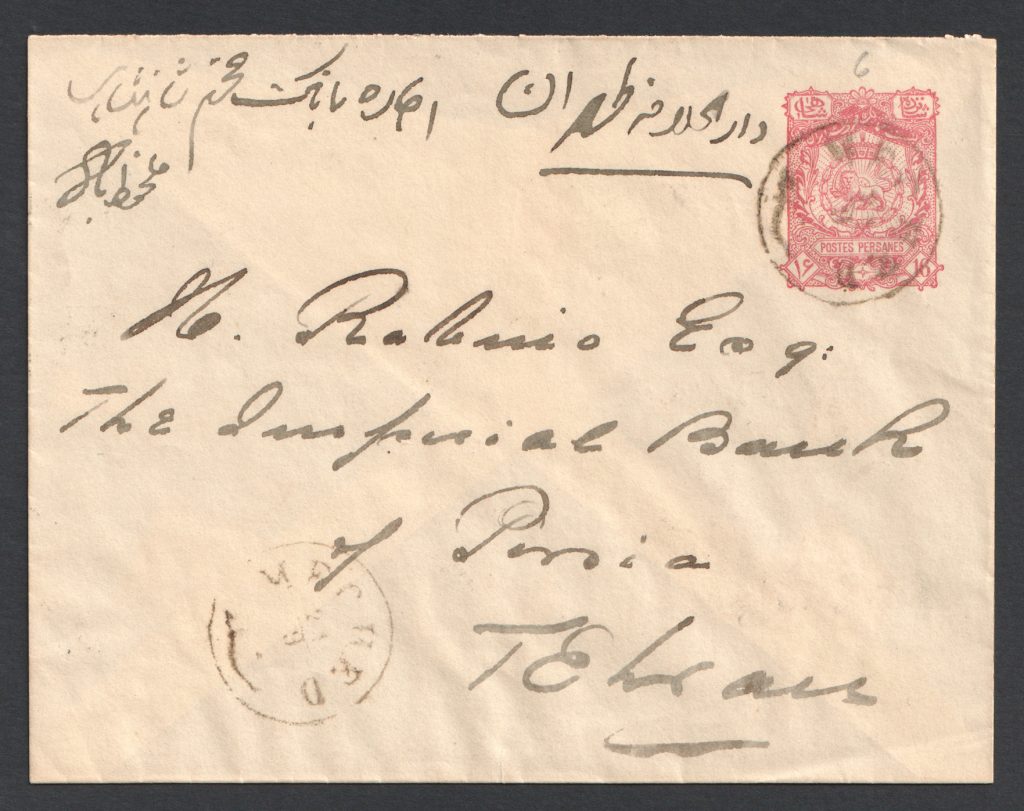 ” پاکت استیشنری ۱۲ شاهی از مشهد به تهران برای بانک شاهنشاهی “