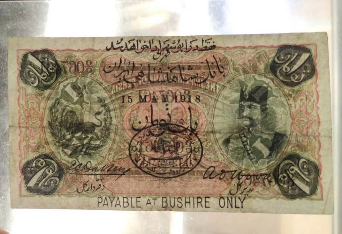 اسکناس 2 تومان سری اول قاجار شهر بوشهر کیفیت VF ، تعمیر و شسته و پرس دارد، بسیار کمیاب در این کیفیت